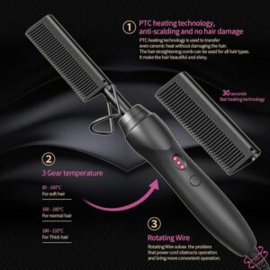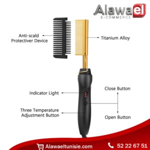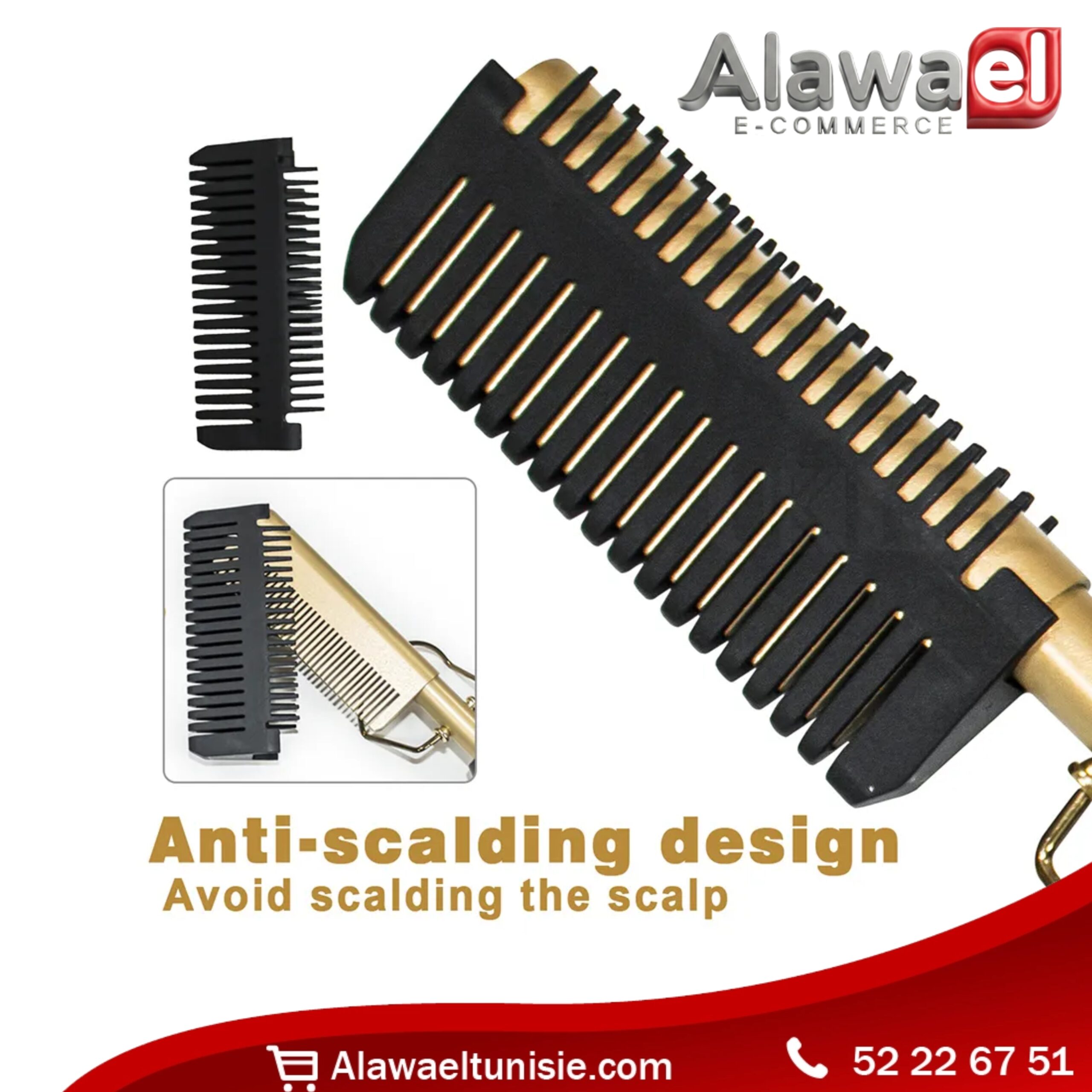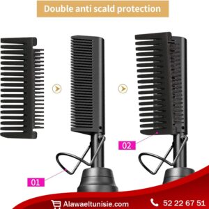 صحتك وفروة رأسك في أمان! المشط مجهز بأسنان سيراميك توزع الحرارة بانتظام، ويجي معاه غطاء حماية إضافي يركب ويتنحى باش يحمي فروة الرأس واليدين من الحروق تماماً.